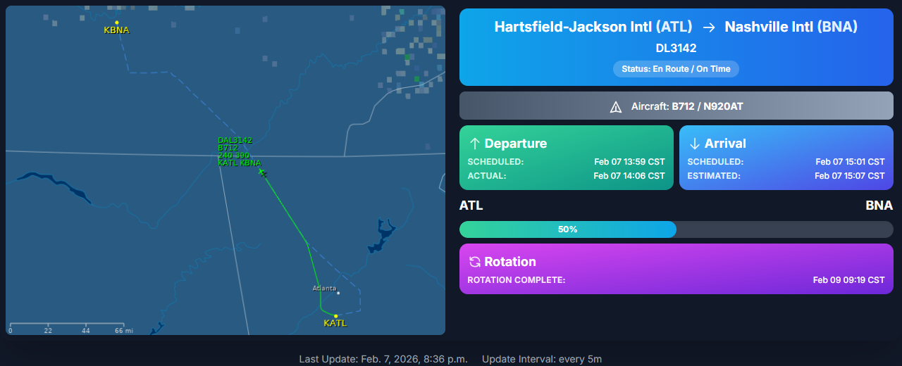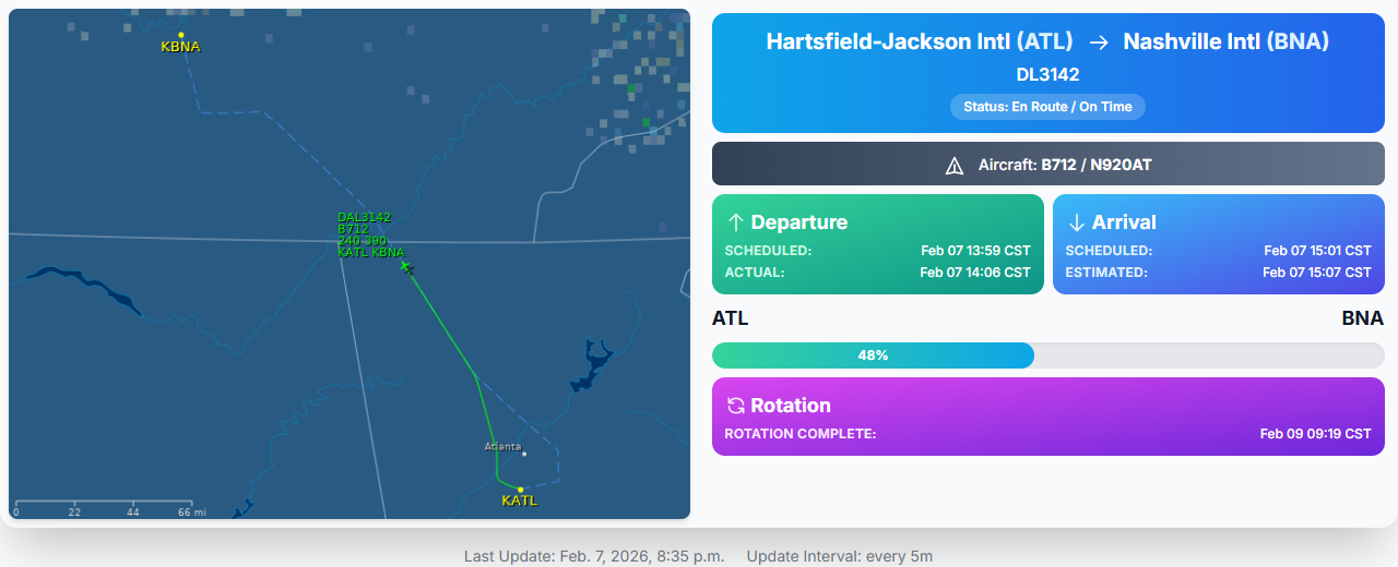 Flight info is displayed on a webpage, which can be displayed on a tablet or home devices like a DAKBoard or Home Assistant.